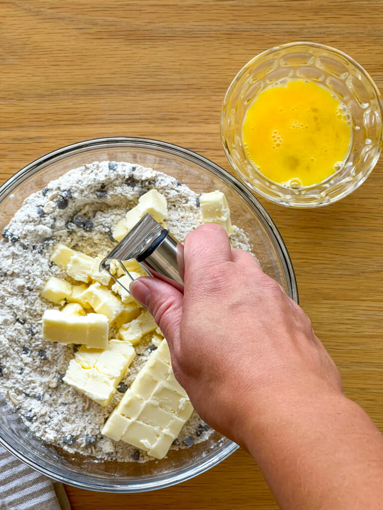 - With clean hands (or a pastry cutter) crumble the small chunks of cold cubed butter into the mix until a crumbly dough forms and holds together when pressed.