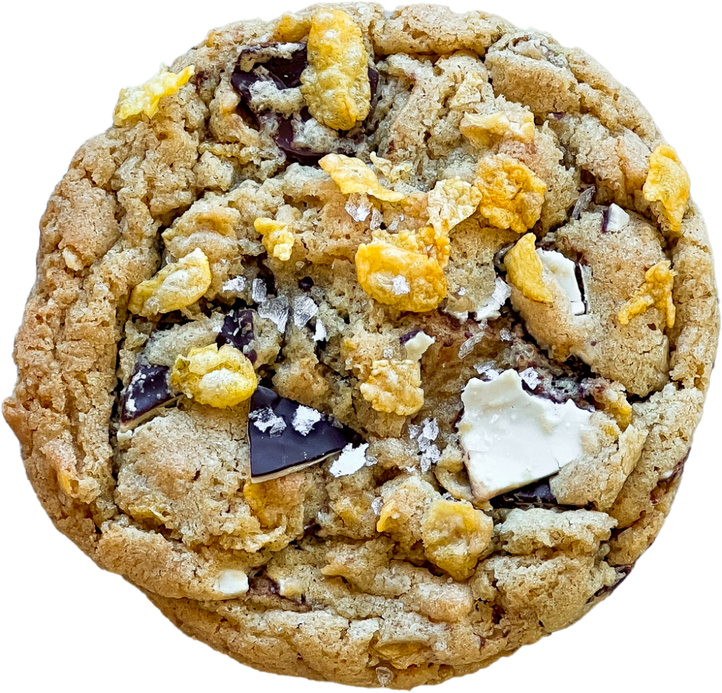 The Happy Camper cookie is comfort in cookie form. A rich brown butter cornflake cookie with crispy edges and a chewy center. Swirled with creamy homemade white and dark chocolate bark then finished with sea salt flakes. Sweet, salty and perfectly nostalgic like a treat by the campfire.